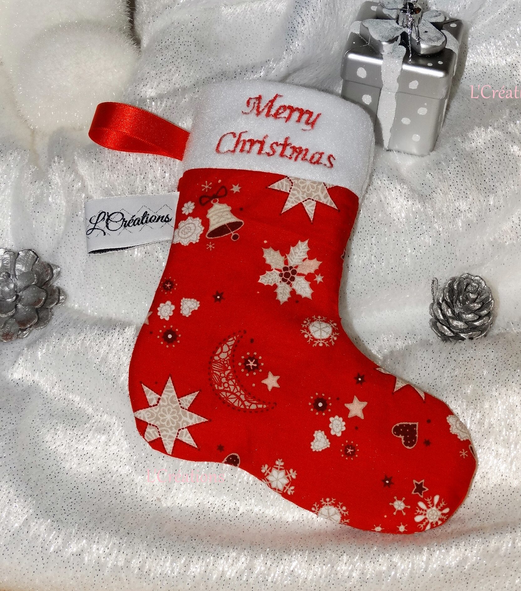 De jolies chaussettes de Noël personnalisées, à mettre dans votre sapin ou en décoration. Cette chaussette est réalisée en coton motifs Noël pour l’extérieur et en polaire blanc pour l’intérieur et haut de la chaussette.